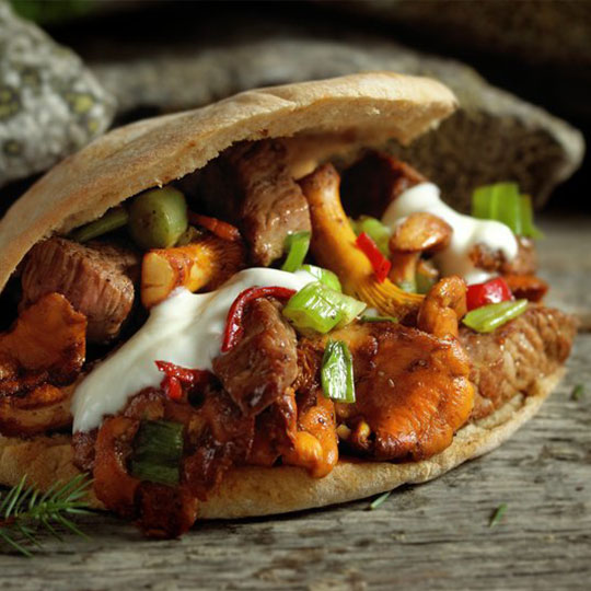 Kebabkött (Fläskkarré), Isbergssallad, Tomater (Färska), Rödlök, Feferoni, Kebabsås Stark, Vitlökssås, Chilidressing
