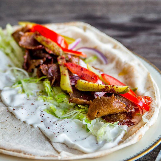 Beskrivning: Kebabkött (Nötkött), Isbergssallad, Tomater (Färska), Rödlök, Feferoni, Kebabsås Stark, Vitlökssås, Chilidressing