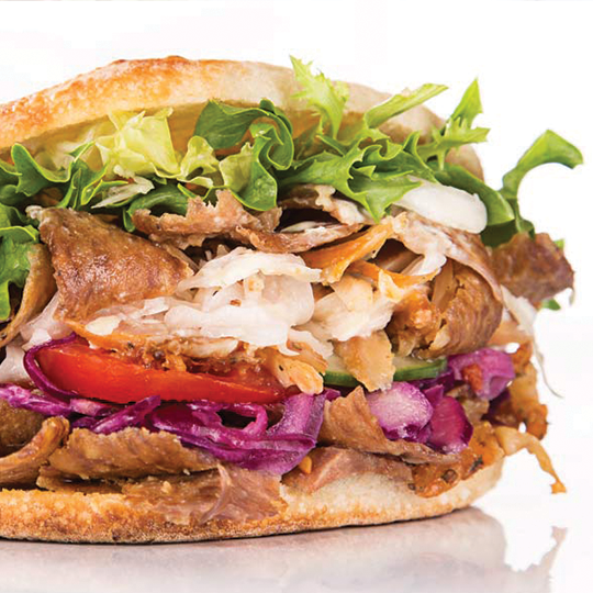 Beskrivning: Kebabkött (Fläskkarré), Isbergssallad, Tomater (Färska), Rödlök, Feferoni, Kebabsås Stark, Vitlökssås, Chilidressing